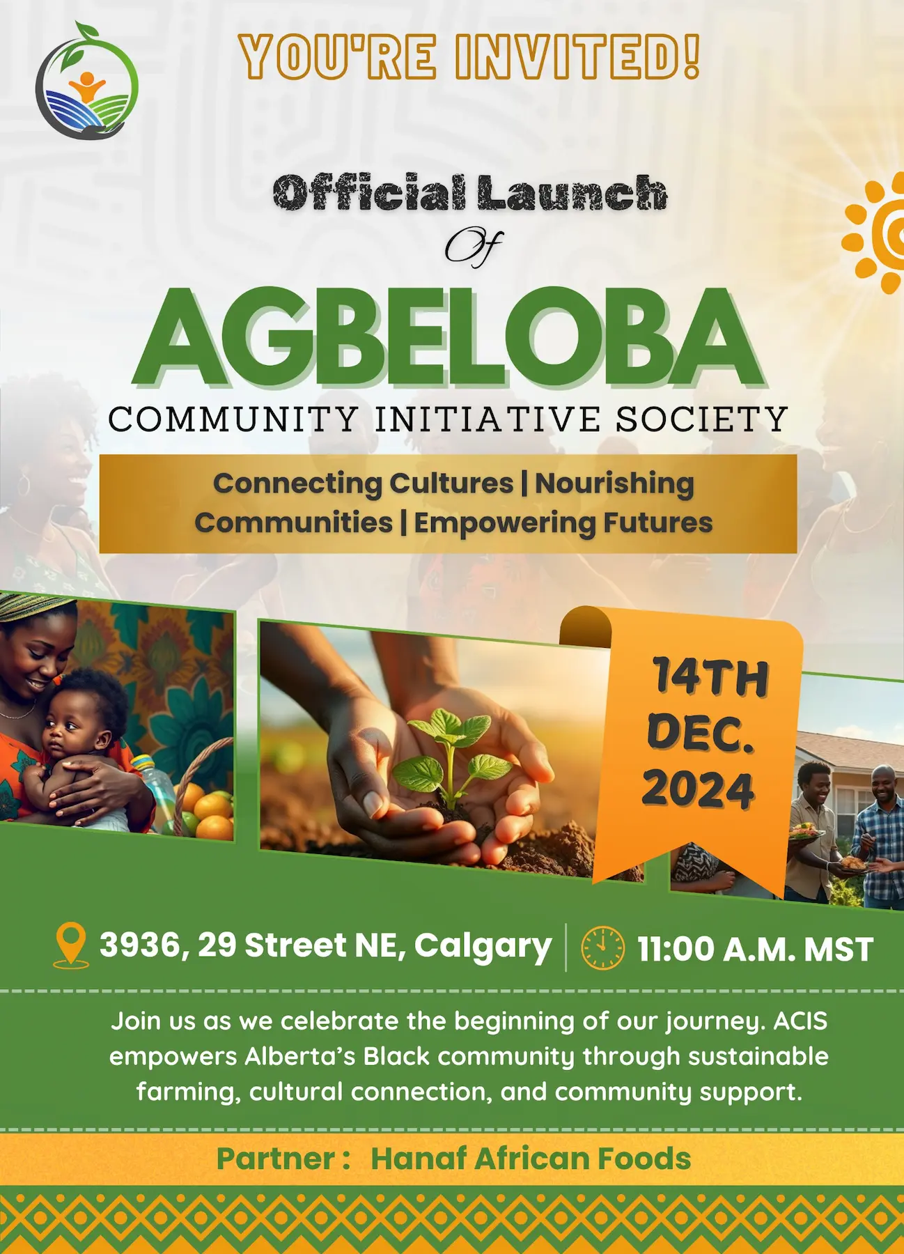 On December 14, 2024, the Agbeloba Community Initiative Society (ACIS) proudly launched in Calgary, commemorating our commitment to empowering Alberta’s Black community through sustainable farming, cultural exchange, and community-focused initiatives. In partnership with Hanaf African Foods, this milestone event marked the beginning of a transformative journey toward connection, nourishment, and shared prosperity.